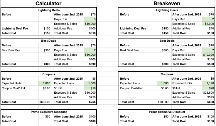 Lightning Deals from $150 flat fee to $70 daily and 1% of sales (capped at $2k)